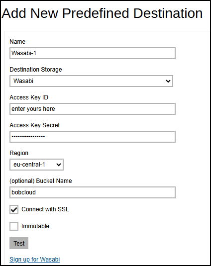 If you prefer to reduce your storage costs, connect your backup sets to your own Wasabi account as shown below.